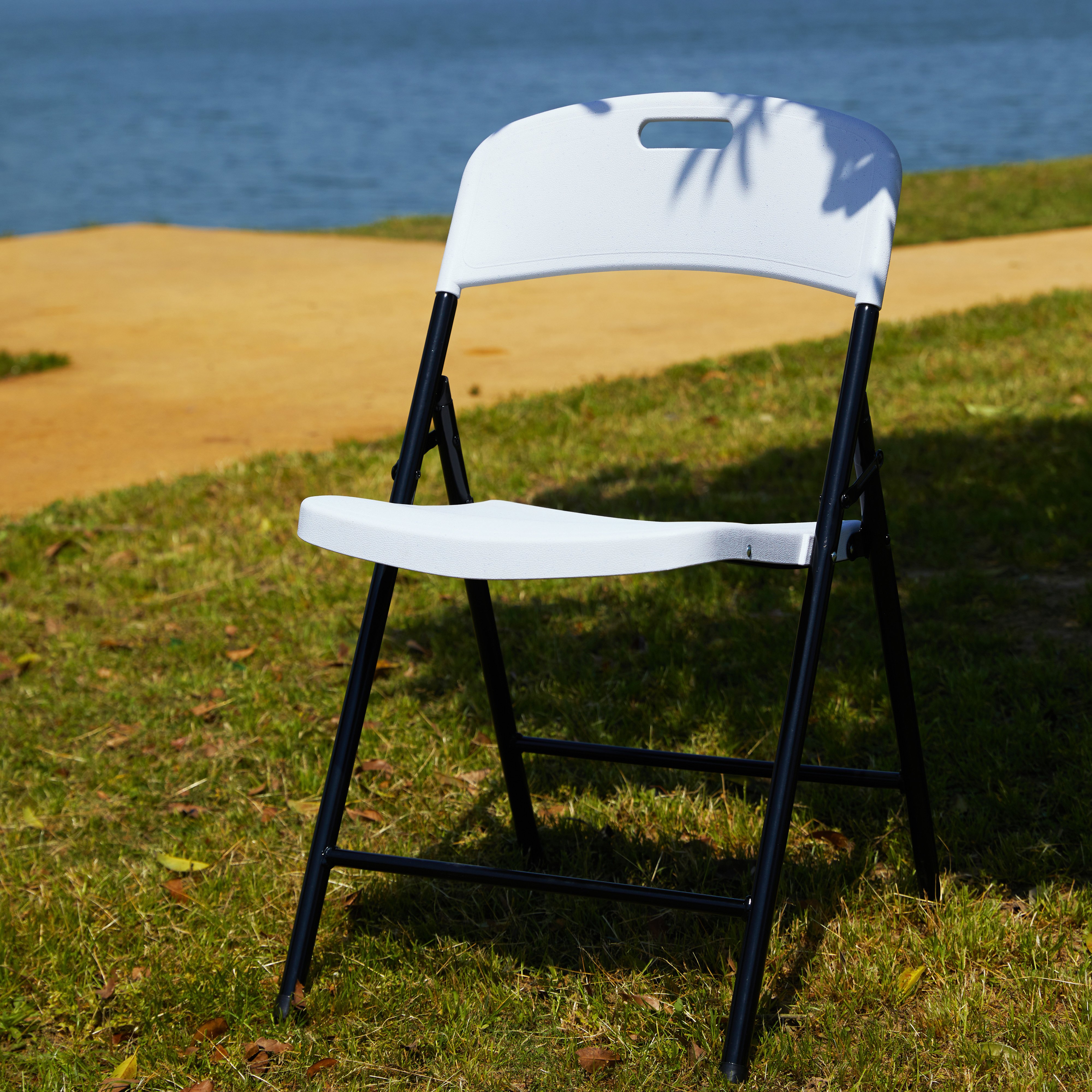 Built to support up to 350 pounds; the folding chair features a sturdy molded plastic seat and back with steel cross braces and legs.Reinforced Construction