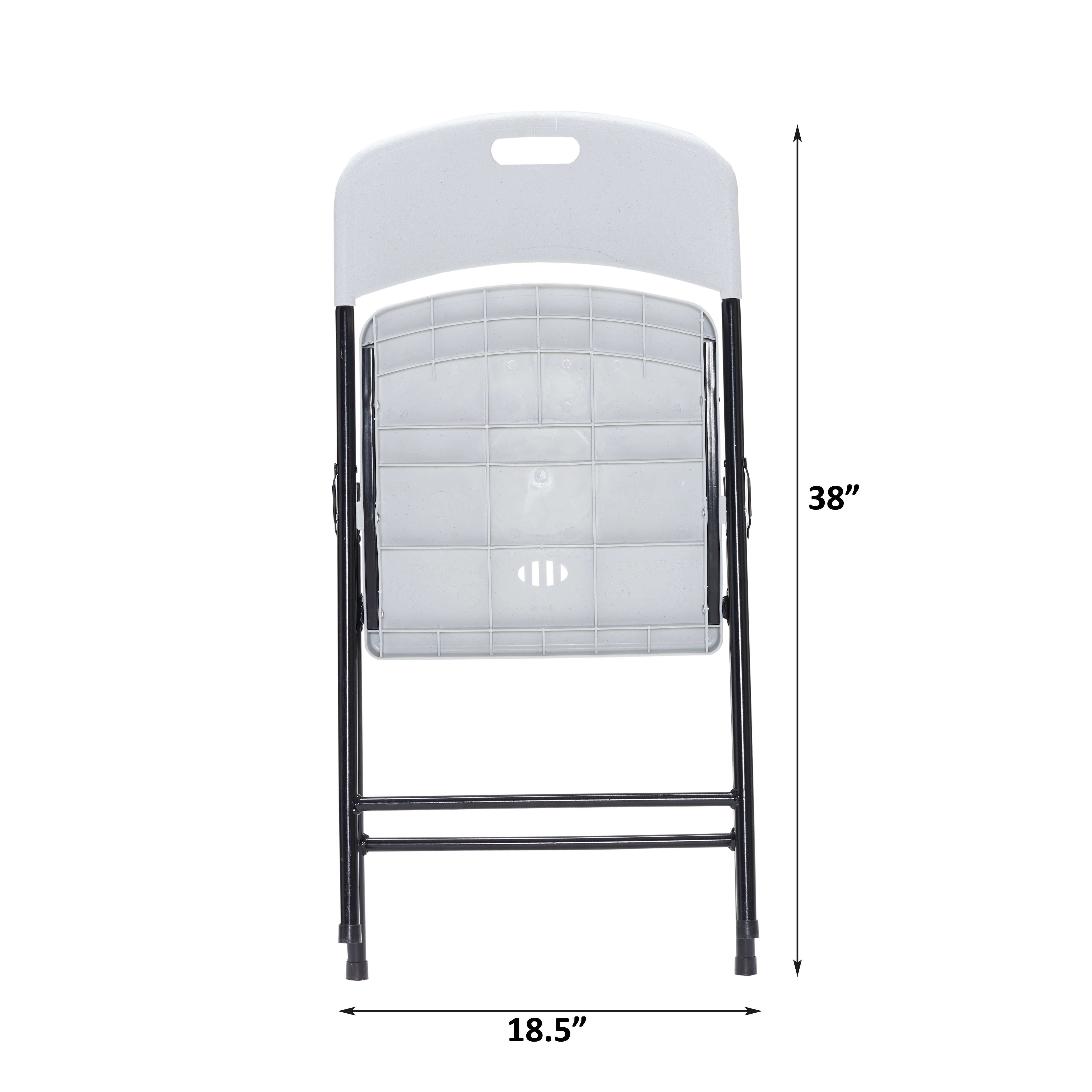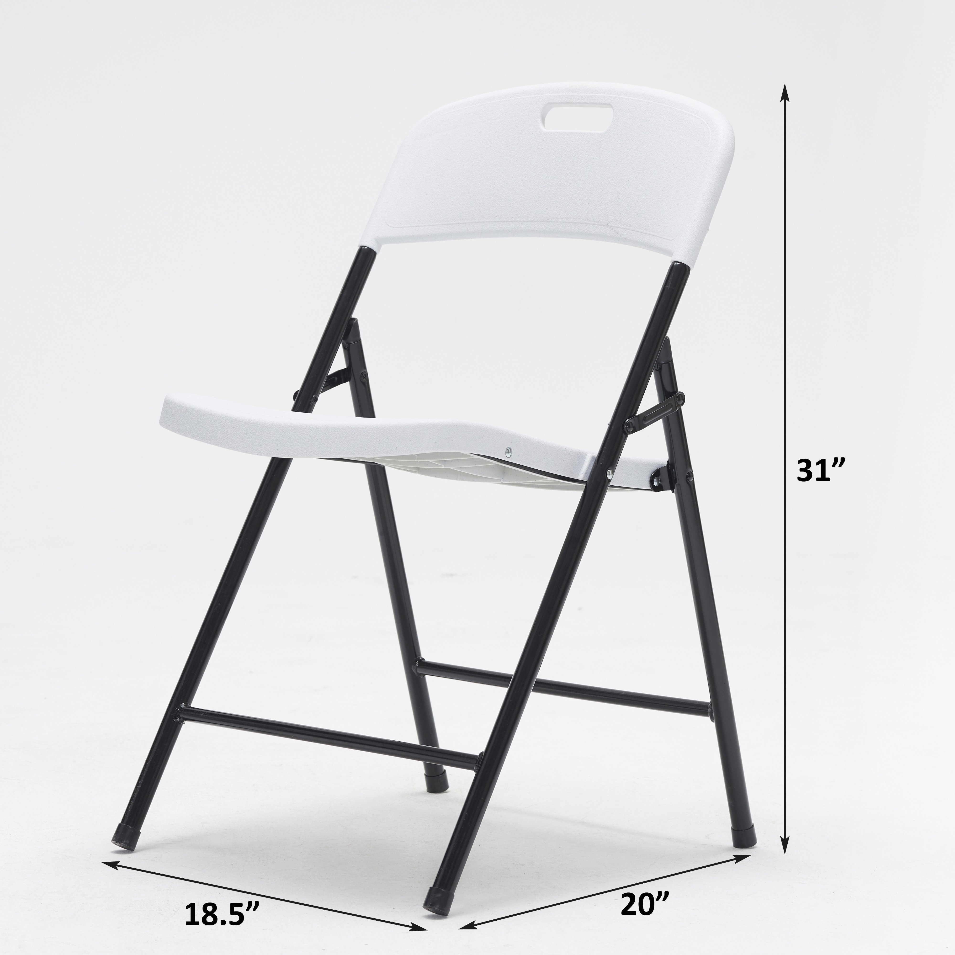 Specifications: Overall Dimensions: 18.5" x 20" x 31" / 47*51*78cm Chair Seat Height: 17.9" / 45.5cm Folding Chair Net Weight: 7.1 lbs/ 3.2KG Chair Color: White Chair Material: PP Chair Frame Color: Black Chair Frame Material: Powder-Coated Steel Chair Weight Capacity: 350 lbs. Package Weight: 38.58lbs / 17.5KG Package Size: 39.25" x 8.27" x 20.00" All chairs are packed in thick double-cartons with extra protection for delivery.
